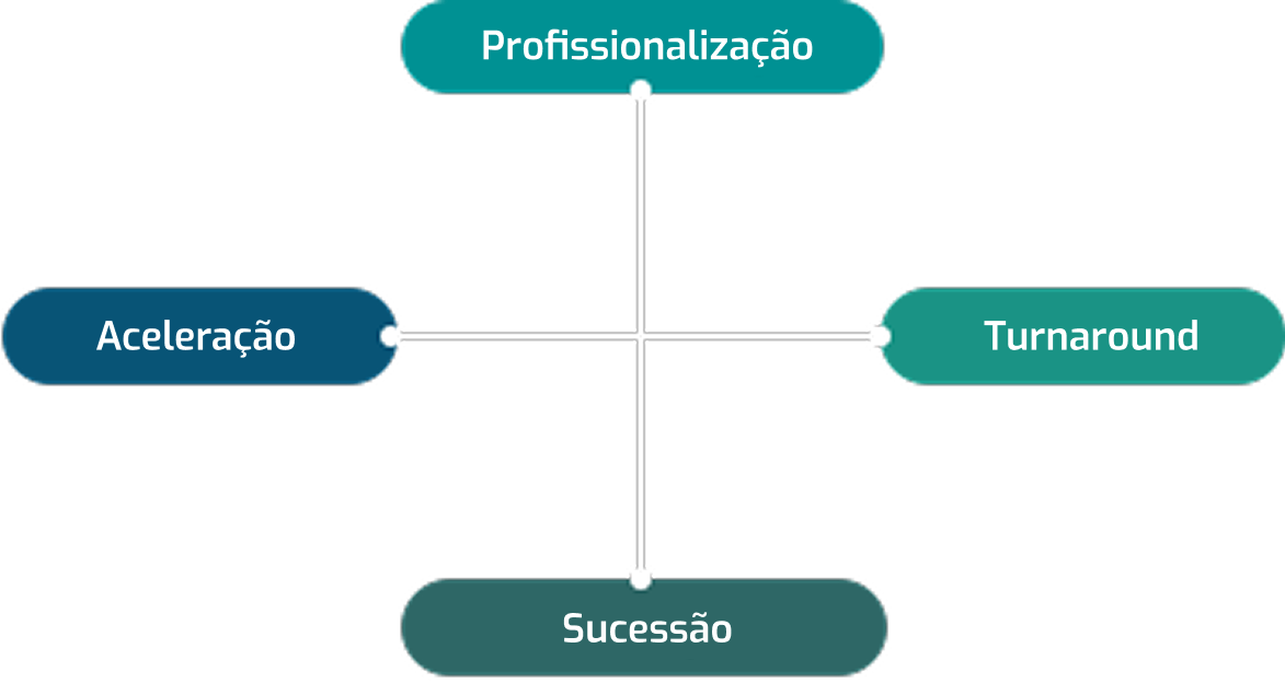 Temos 4 grandes cenários de atuação que se alinham com objetivos e momento de cada um dos clientes, pois demandam expertise e ações específicas de nossa parte.
